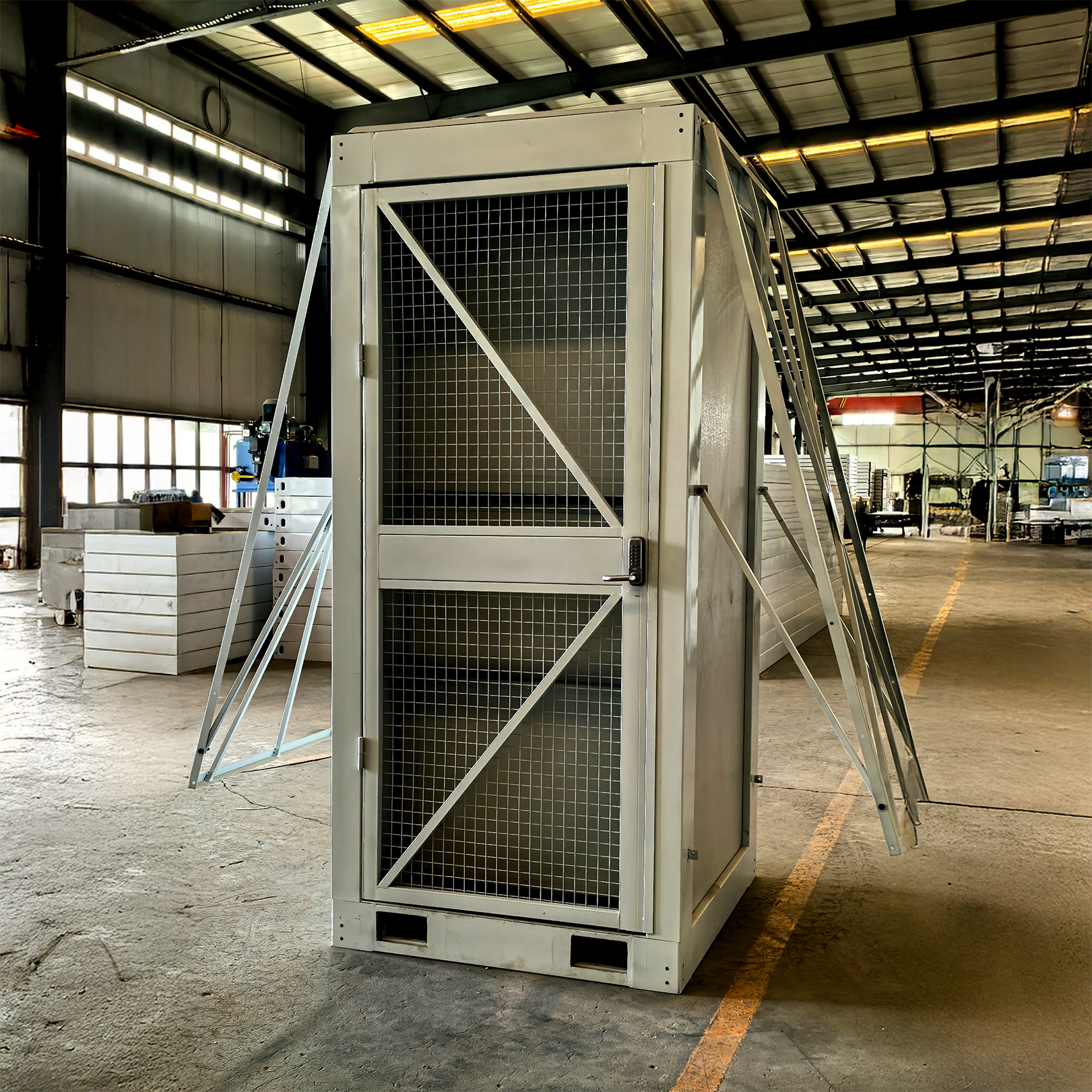 The dual-security door system adds layered protection without sacrificing airflow, combining a commercial-grade locking steel exterior door with an interior metal wire-mesh door that shields equipment while allowing ventilation.